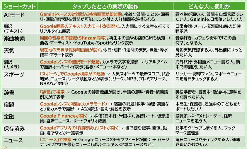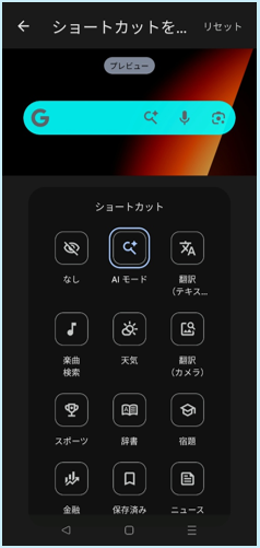 「AIモード」「翻訳(テキスト)」「楽曲検索」「天気」「翻訳(カメラ)」「スポーツ」「辞書」「宿題」「金融」「保存済み」「ニュース」から選択できます。