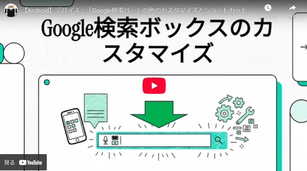 【設定】⇒【Google】⇒【すべてのサービス】⇒【Googleアプリの設定】⇒【検索、アシスタントと音声】⇒【検索ウィジェット】⇒【ウィジェットのカスタマイズ】から、「ロゴ」「形状」「背景色」「透明度」のカスタマイズができます。