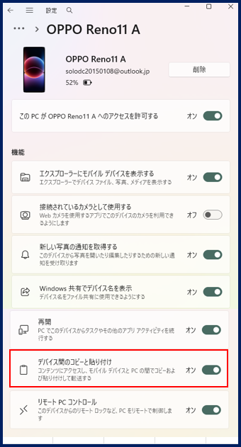 PCの「スマートフォン連携」アプリで、【機能】⇒「追加の設定」⇒【デバイス間のコピーと貼り付け】を「オン」にします。