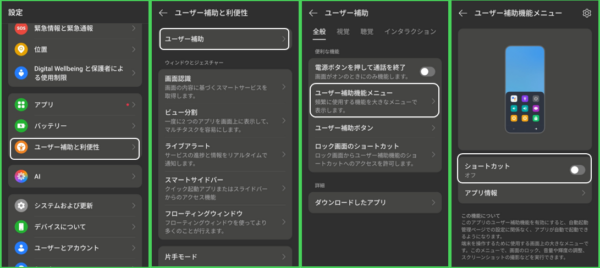 【設定】>【ユーザー補助と利便性】>【ユーザー補助】>【ユーザー補助機能メニュー】>「ショートカット」のトグルを右にスライドして有効にします。