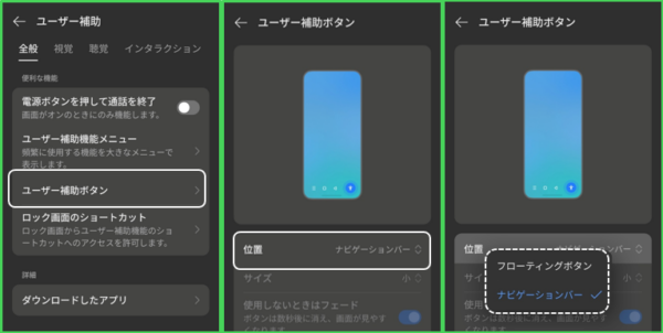 【設定】>【ユーザー補助と利便性】>【ユーザー補助】>【ユーザー補助ボタン】>【位置】をタップします。
