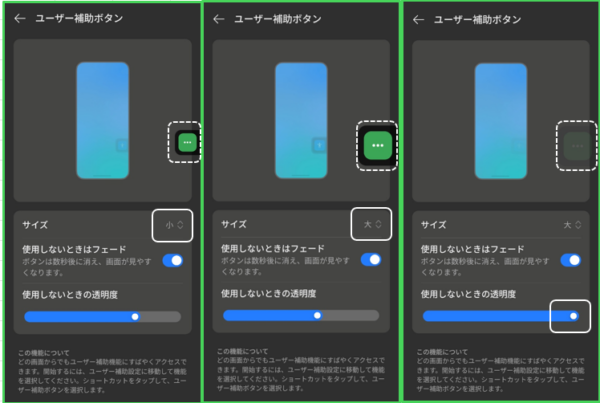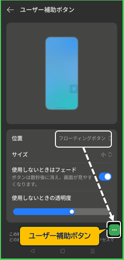 フローティングボタンは、その大きさ(「小」「大」)と使用していないときのボタンの透明度をカスタマイズできます。