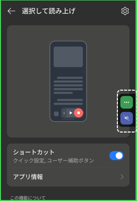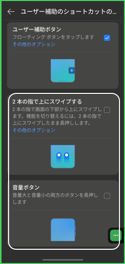 「音量ボタン」を選択すると、音量ボタンの「大」「小」を同時に長押ししたときに、ユーザー補助機能メニューにアクセスできます。