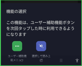 他の機能のショートカットが有効になっていないときに、ボタンをタップすると「ユーザー補助機能メニュー」がダイレクトに表示されます。