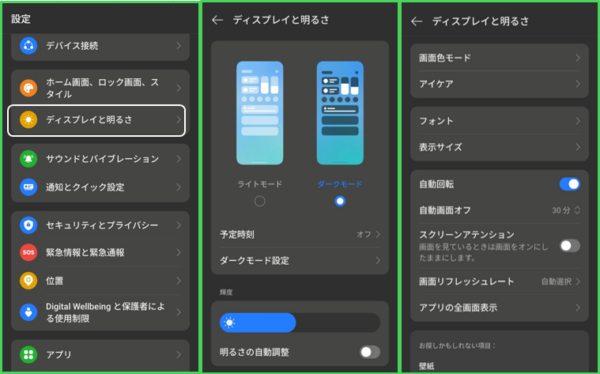 「明るさの自動調整」を有効にすると、周囲の明るさに合わせて画面の明るさを自動的に調整できます。