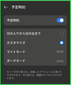 ・カスタマイズ:予め「ライトモード」と「ダークモード」に切り替える時刻を設定できます。