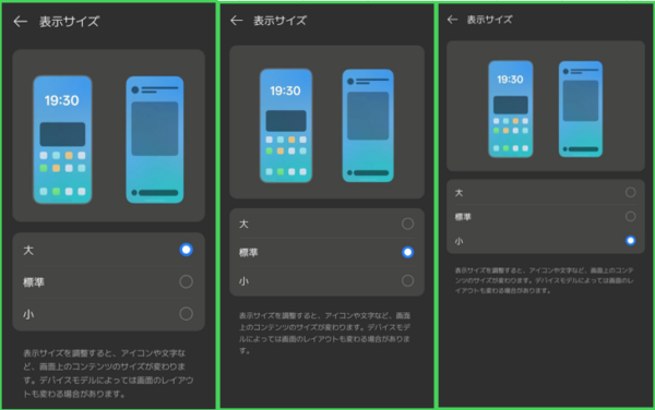 表示サイズを「大」「標準」「小」から選択できます。