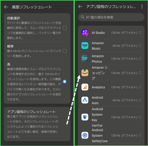 「高」を選択すると、アプリごとに「60Hz」「90Hz」「120Hz」の設定ができるようになります。