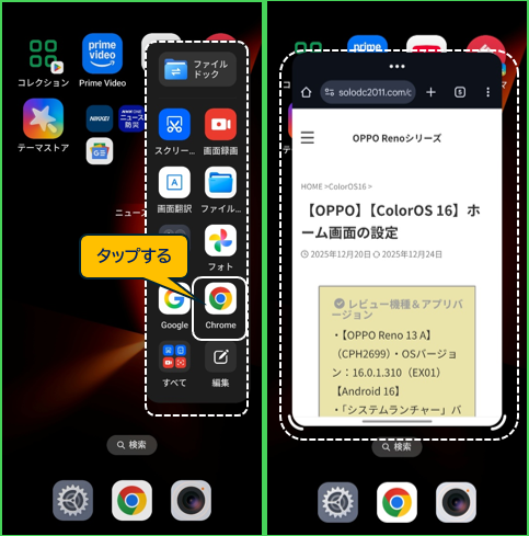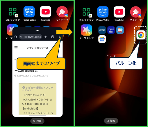 | アプリの入れ替え ※要設定 | 画面に表示されているアプリが、フローティングウィンドウになり、フローティングウィンドウのアプリが、ミニウィンドウになります |