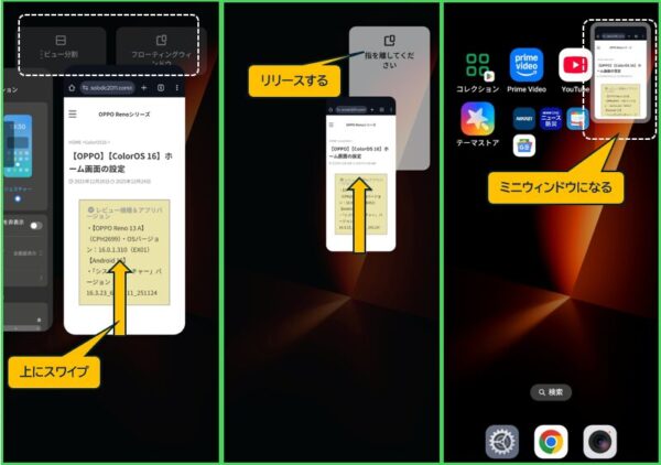 ジェスチャーナビゲーションを採用していて、かつ、そのアプリが「フローティングウィンドウ」機能に対応している場合は、画面下部から上方向にスワイプして「フローティングウィンドウ」⇒「指を離してください」と表示されたときにリリースすると、最小化(ミニウィンドウ)で開くことができます。