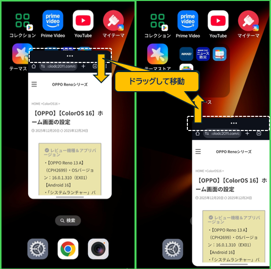 分割画面で、2つのアプリを同時に表示しているときに、そのアプリの上側ある横3ドット(「…」)をドラッグして、アプリアイコンの表示に変わったときにドロップすると、フローティングウィンドウになります。