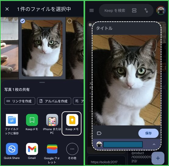 有効にすると、ファイル等を共有した先のアプリがフローティングウィンドウで開きます。※試した中では「Google Keep」だけでした。