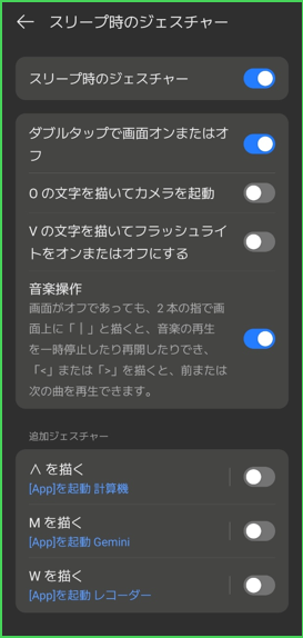 「スリープ時のジェスチャー」を有効にすると、画面オフあるいはAODからアプリの起動等ができます。