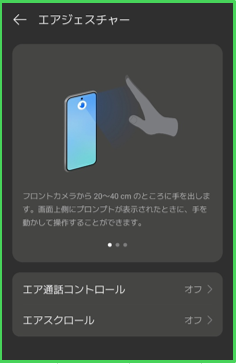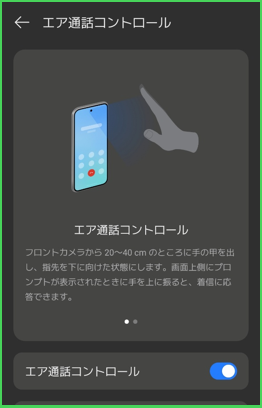 フロントカメラに向かって、20~40cm離れたところでハンドジェスチャーすると、画面に触れることなく端末を操作することができます。