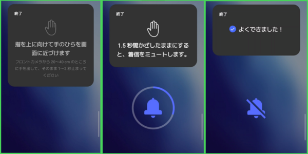 手にひらを画面に近づけて、1.5秒間かざすと、着信をミュート(消音)できます。