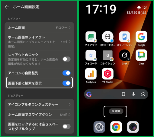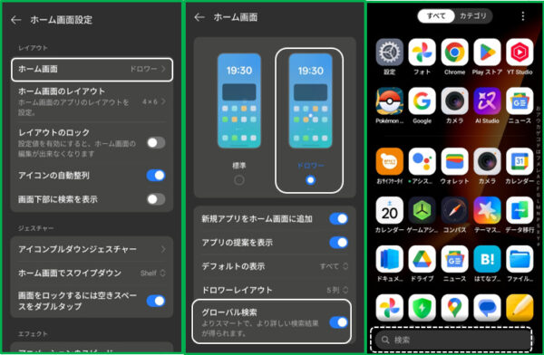 【ホーム画面設定】>【ホーム画面」で「ドロワー」を選択>「グローバル検索」を有効にします。