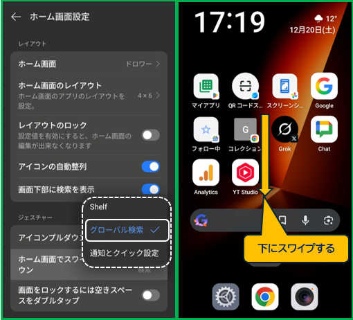 【ホーム画面設定】を開いて、「ホーム画面でスワイプダウン」から「グローバル検索」を選択します。