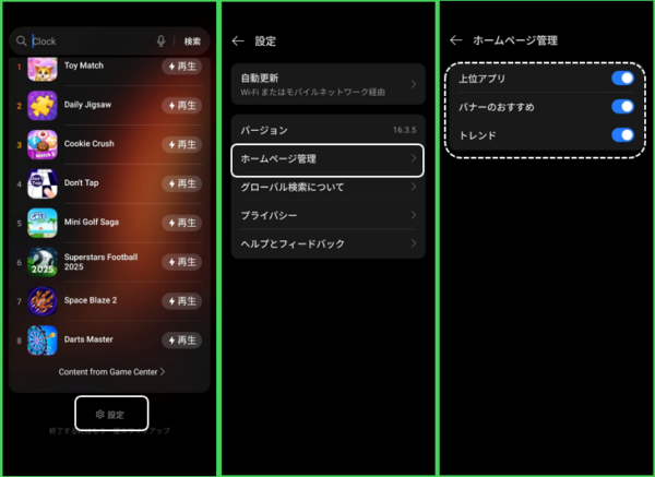 「ホーム画面」の検索前のグローバル検索画面の「バナーのおすすめ」と「トレンド」は必要ないので、無効にします。