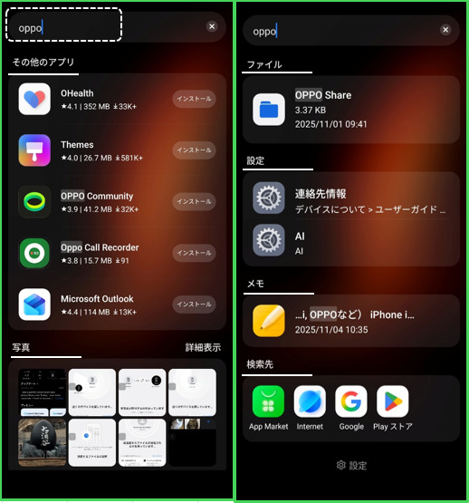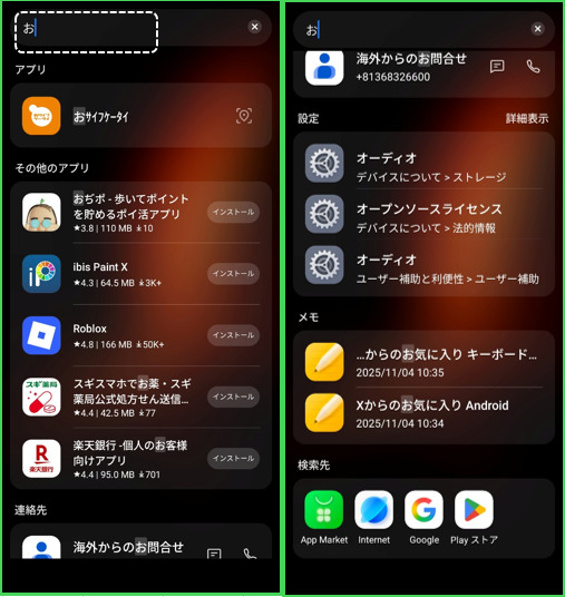 「ホーム画面」と「ドロワー画面」で、グローバル検索の仕様に違いがあるようです。「ドロワー画面」はアプリ検索に特化しているようです。
