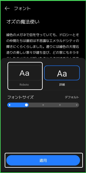 デフォルトに戻したいときは、【設定】>【ディスプレイと明るさ】>【フォント】>「Roboto」を選択して「適用」をタップします。