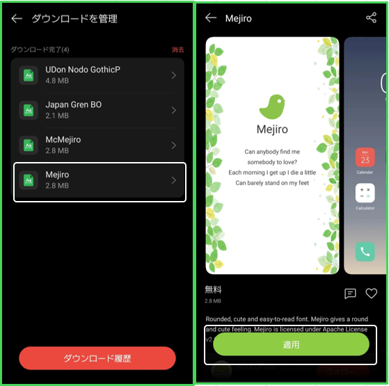 ダウンロードしたフォントを切り替えたいときは、【テーマストア】アプリの「マイページ」>「ダウンロードを管理」から切り替えたいフォントを選択して、「適用」をタップします。