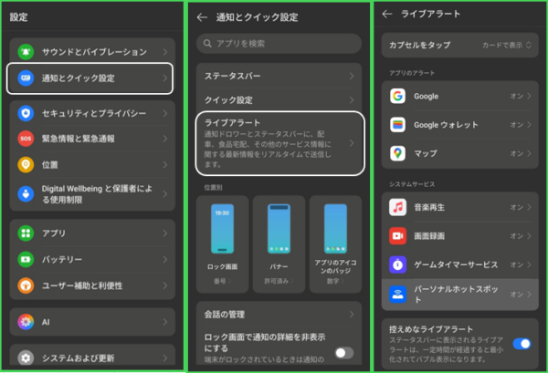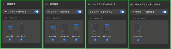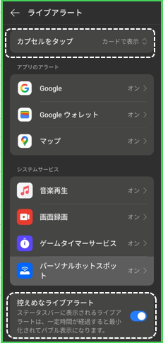 【設定】>【通知とクイック設定】>【ライブアラート】をタップすると、【ライブアラート】画面になります。