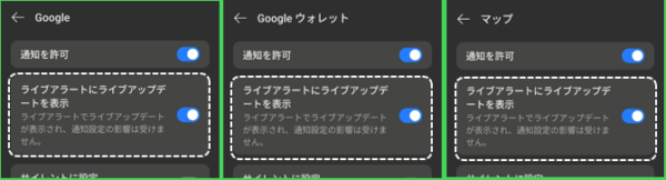 「Google」「Googleウォレット」「マップ」をタップして、表示されるそれぞれの「通知の管理」画面の「ライブアラートにライブアップデートを表示」を有効にしておくと、そのアプリが、ライブアップデート通知を送信したときに、「ステータスバー」「ロック画面」「通知ドロワー」で確認することができます。