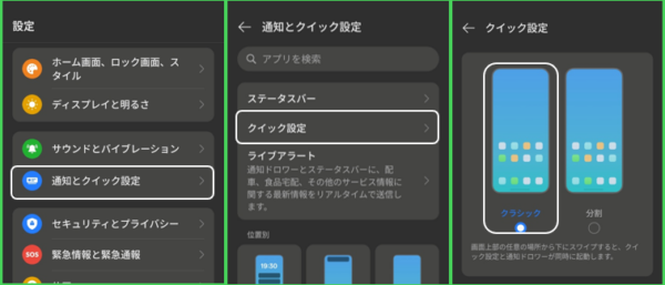 ユーザーは「クイック設定」のスタイルを【設定】>【通知とクイック設定】>【クイック設定】から、「クラシック」か「分割」のいずれかを選択します。