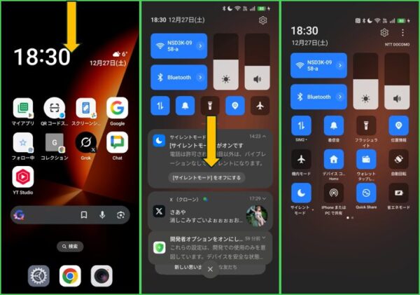 冒頭に紹介した「ステータスバー上の右側を下にスワイプ」するほかに、クイック設定にアクセスする方法になります。