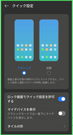 | マイデバイスを表示 | 有効にすると、クイック設定の下段に「マイデバイス」のタイルを表示できます。※3,⑥参照 |