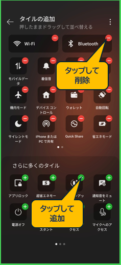クイック設定にアクセスしたときの上段にある「タイル」以外からできることになります。