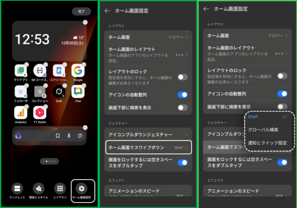 無効化するときは、ホーム画面上を長押しして、【ホーム画面設定】をタップして、【ホーム画面でスワイプダウン】をタップして、他の設定「グローバル検索」または「通知とクイック設定」に変更します。