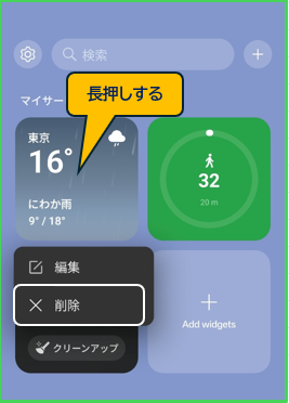 ウィジェットを長押し して、オプションメニューの「削除」をタップします。