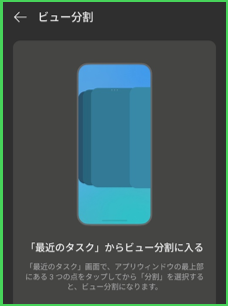 最近のタスク画面を開いて、レビュー画面の右上にある3ドットボタンをタップして、オプションの「ビュー分割」をタップします。