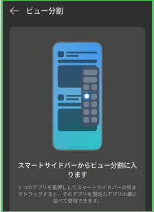「スマートサイドバー」を開いて、パネルにあるアプリアイコンを長押しして、画面外までドラッグ&ドロップすると、そのアプリが画面上側に表示されるので、下の画面に表示するアプリを選択すると、画面分割モードになります。