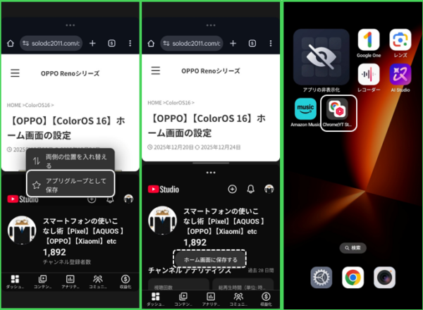 ②タップして、ホーム画面に分割画面アイコンを追加する ※【ColorOS 15】からの機能