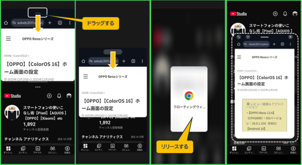各画面の上部にある横3ドットをドラッグ&ドロップすることで、フローティングウィンドウにできます。