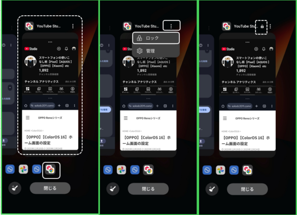画面分割を解消しないまま、他のアプリを開くと、その画面分割は最近のタスク画面に履歴として残ります。「ロック」すると、いつでも画面分割のまま復帰することができます。