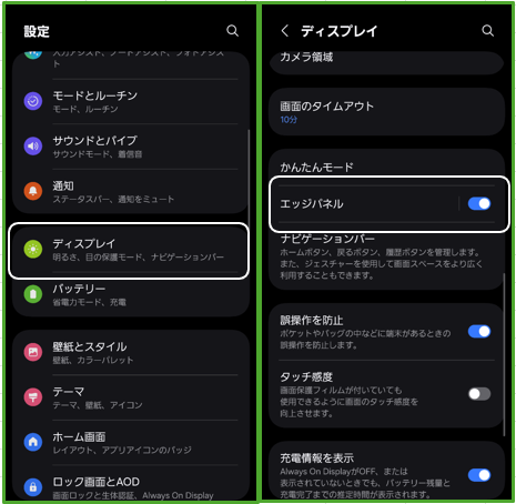 【設定】>【ディスプレイ】>「エッジパネル」を有効にします。(※初期設定:「有効」)
