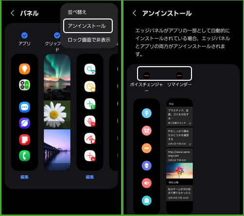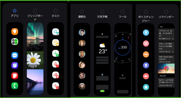 「(エッジパネル)ハンドル」を画面の内側にスワイプして、表示する「パネル」は、それぞれのパネルの上にある「○」をチェックするだけで、追加または削除ができます。