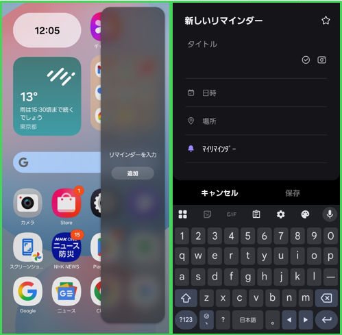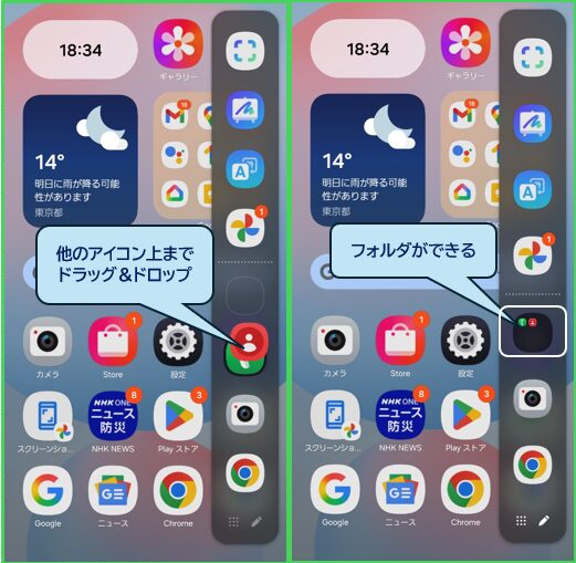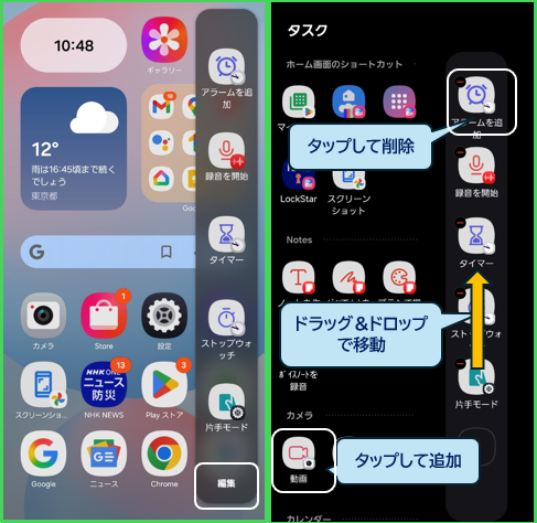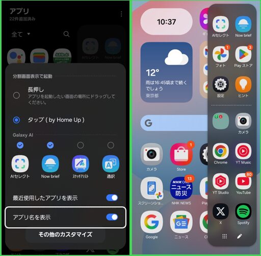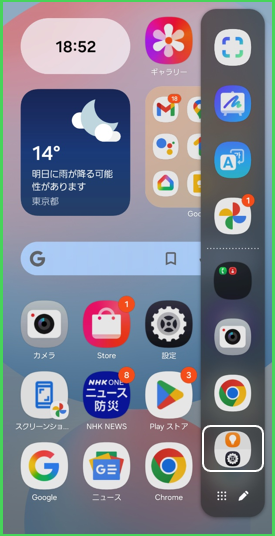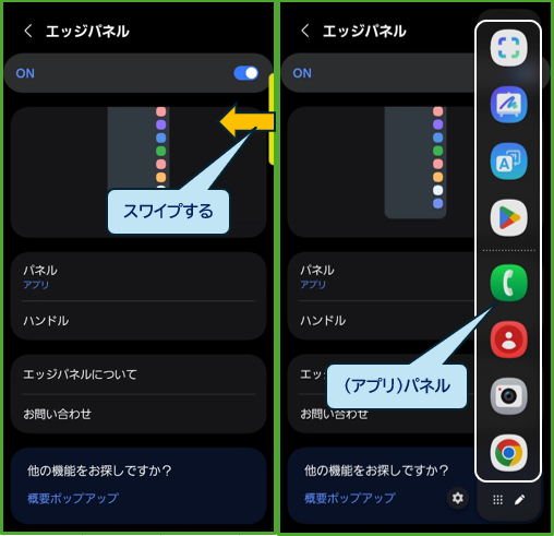 1)アプリアイコンをタップしたときの開き方 ※【ホームアップ>エッジパネル」の拡張機能