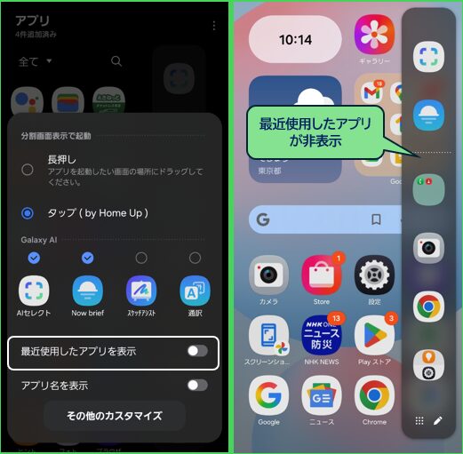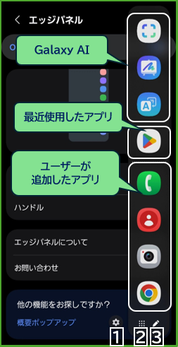 「パネル」内の構成は、上から「Galaxy AI」「最近使用したアプリ」「ユーザーが追加したアプリ」等になります。