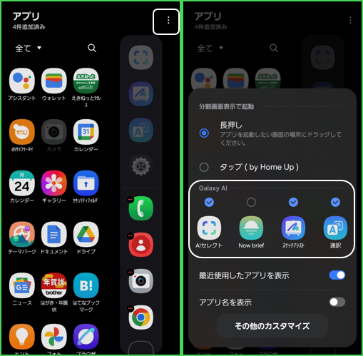 ③をタップして、編集画面の右上にある3ドットボタンをタップして、「Galaxy AI」から、「AIセレクト」「Now Brief」「スケッチアシスト」「通訳」の追加/削除ができます。