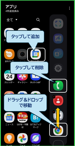 ・並べ替え:パネル内のアプリアイコンをドラッグ&ドロップします。(※編集画面にしなくても可能です)