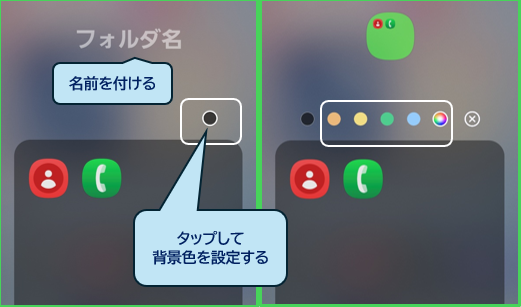 フォルダアイコンをタップして、フォルダ名を付けたり、背景色を変更できます。