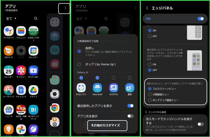 編集画面の右上にある3ドットボタンをタップして表示されるシートの一番下の「その他のカスタマイズ」をタップすると、「ホームアップ」>「エッジパネル」の設定画面が表示されます。