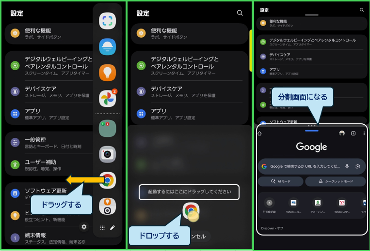 ・「起動するにはここにドラッグしてください」と表示されたところにドロップすると、「分割画面」で開きます。