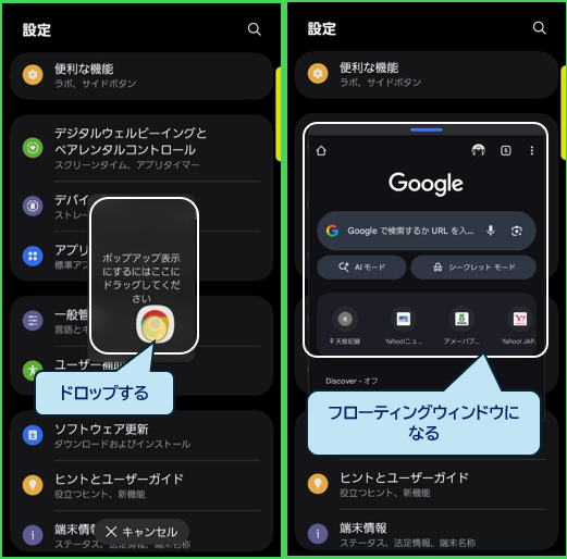 ・「ポップアップ表示にするにはここにドラッグしてください」と表示されたところにドロップすると、「フローティングウィンドウ」(ポップアップ表示」で開きます。