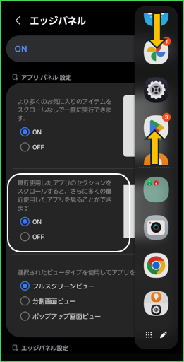 「エッジパネル」の拡張設定画面で、「最近使用したアプリのセクションをスクロールすると…」を「ON」にすると、「Galaxy AI」を含めてスクロールできます。