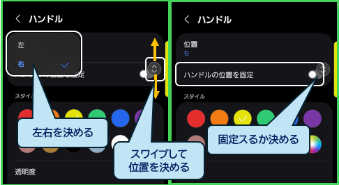 「(エッジパネル)ハンドル」の位置は、画面の「右」端か「左」端にするか、縦位置をどこにするか、固定にするか流動的にするか、自由にカスタマイズできます。